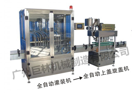 盖贴标生产线采用柱塞定量充填原理,进瓶、定位、充填、出瓶、上盖、旋盖、贴标均由PLC自动控制,符合GMP标准.适用医药、食品、日化、农药及精细化工的液体充填.